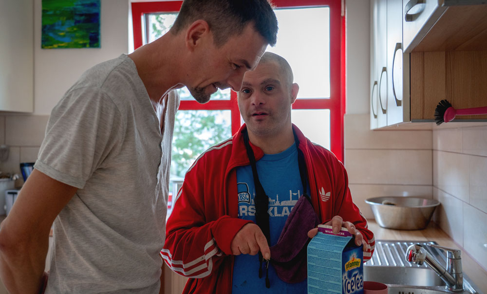 Wir befinden uns im Hans-Riegler-Haus, eine von mehreren Wohnstätten für Menschen mit Behinderungen, die GIB in Berlin-Niederschönhausen betreibt. In diesem Haus leben elf Menschen mit zum Teil starken kognitiven Einschränkungen und psychiatrischen Auffälligkeiten.